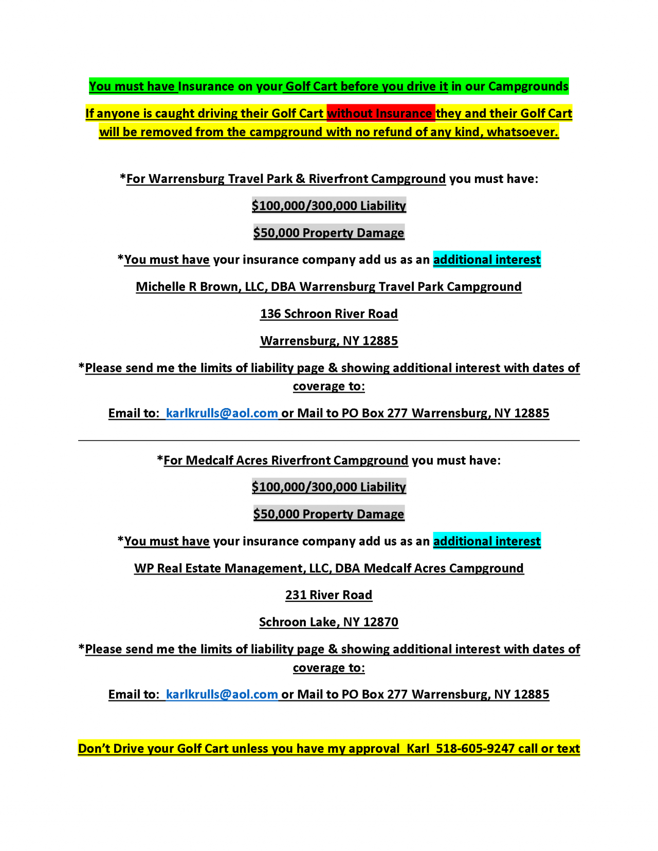 You must have Insurance on your Golf Cart before you drive it in our Campgrounds